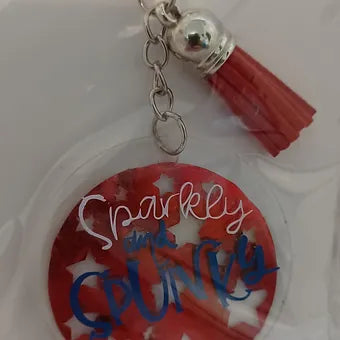 Sparkly & Spunky with a red star background, A 2" acrylic keychain that has a red tassel.
